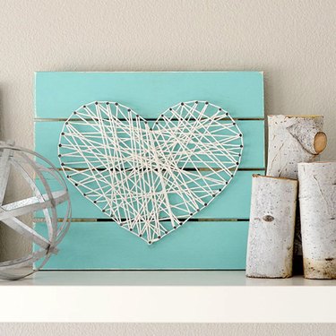 String art is so fun to make, and this string art sign of a heart will definitely become a favorite décor piece in your home. The wood pallet base and jute cord for hanging give this sign its farmhouse charm. You'll find that the simple act of stringing the yarn around the nails is so stress-relieving.