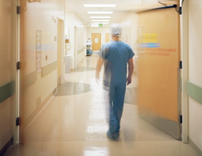 male surgeon in cap and blue scrubs walking down hospital hallway away from camera