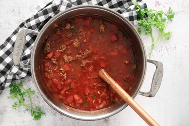 If you're using extra-lean ground beef, chicken or turkey, add 1 or 2 tablespoons of oil to a large pot. Warm over medium heat. Add the ground meat and sausage until brown, breaking it apart with a spatula.