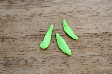 Tear off three small pieces of the Laffy Taffy. These pieces can be larger than the ones you used for the carrot tops. Then shape them into long leaf shapes. Notice that the ones in my example are not particularly symmetrical. That's fine. They look more natural this way.